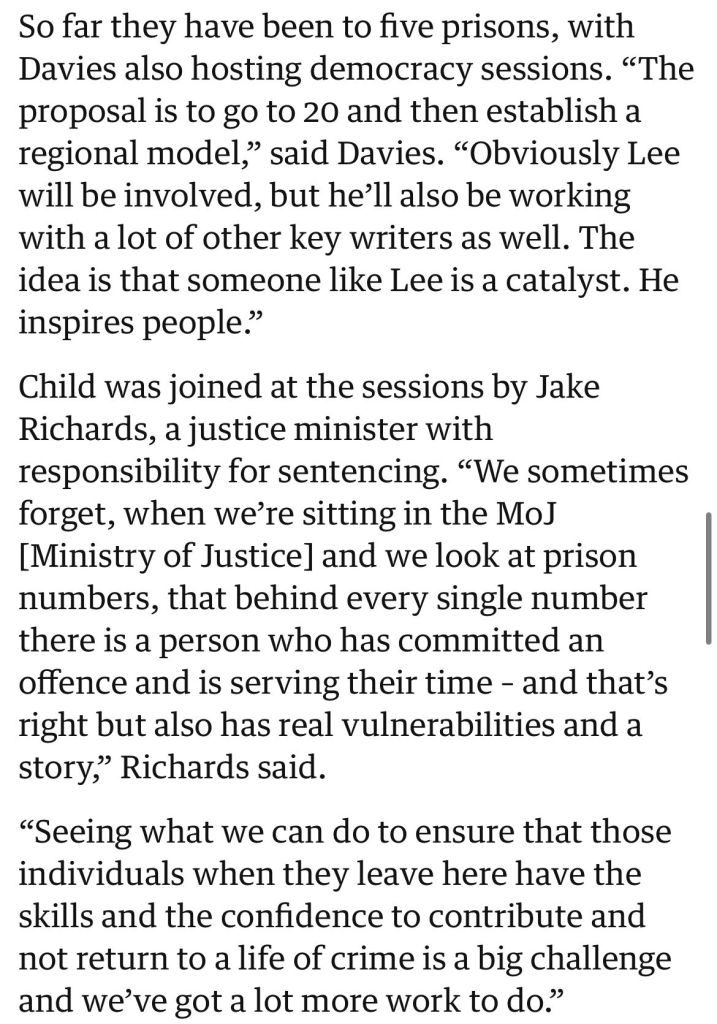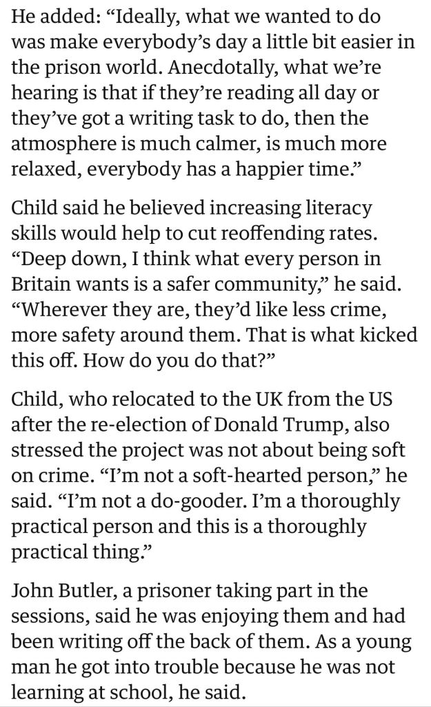 After securing the support of the Prisons Minister Lord Timpson, I launched the Prisons Literacy Project with Lee Child in several Yorkshire prisons this summer